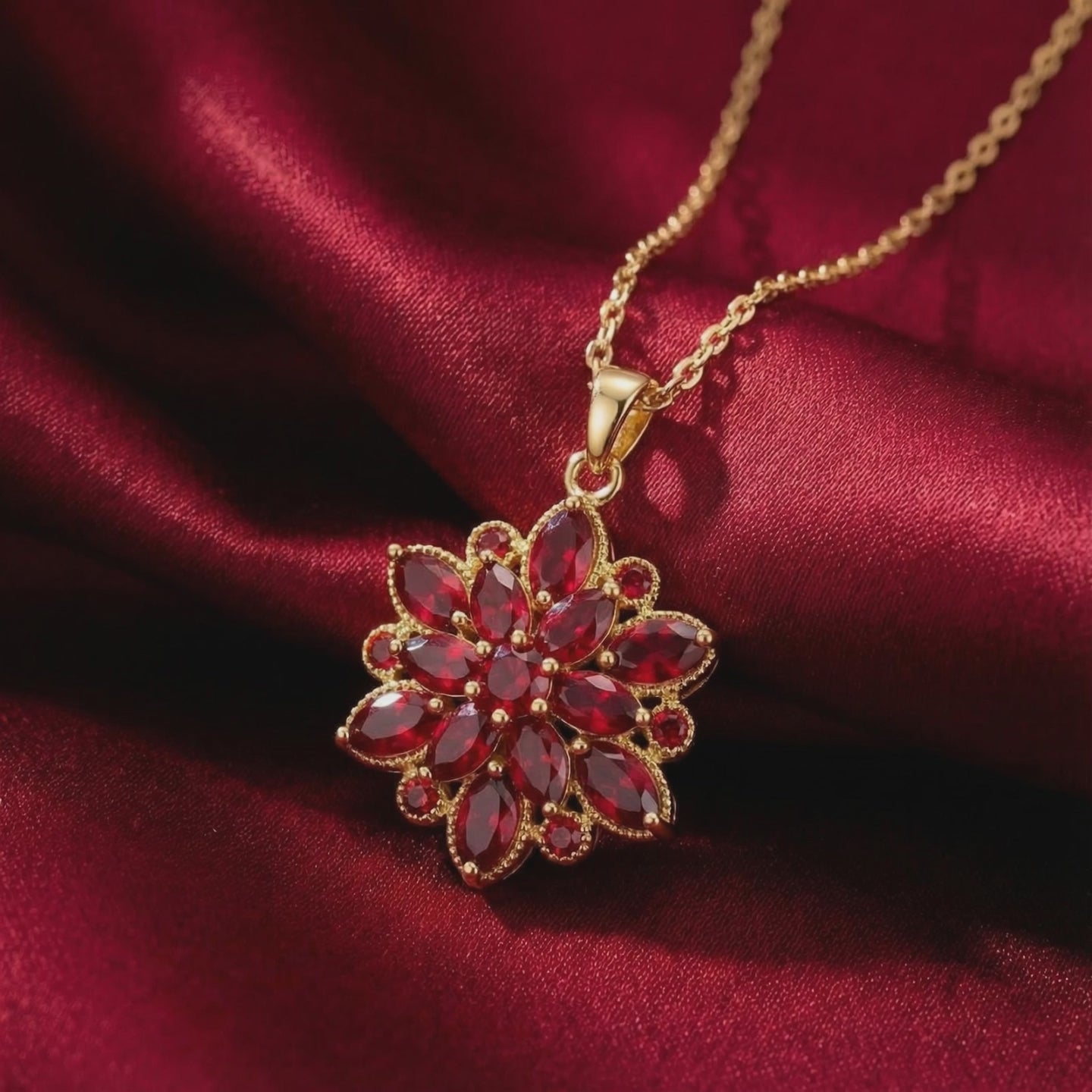 July birthstone simulated ruby blossom necklace in gold-finished stainless steel worn by a model.