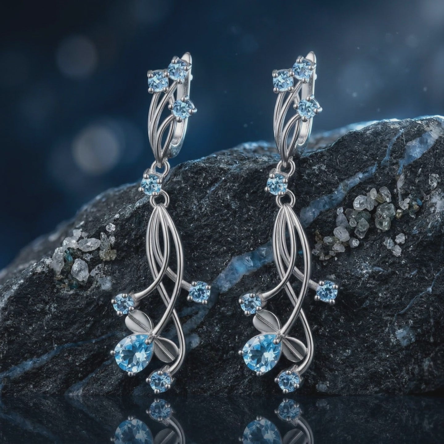 Every stone in this collection is 100% natural topaz — earth-mined silicate gemstone, not lab-created, not glass, not dyed quartz. The signature oceanic blue saturation is activated through a standard industry process (controlled irradiation followed by gentle heat) applied to colorless natural topaz — the same technique used in Swiss Blue Topaz jewelry worldwide for decades.