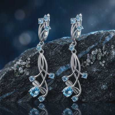 Side view of a model wearing an Oceanis Cascade silver blue topaz drop earring with a cascading vine design.