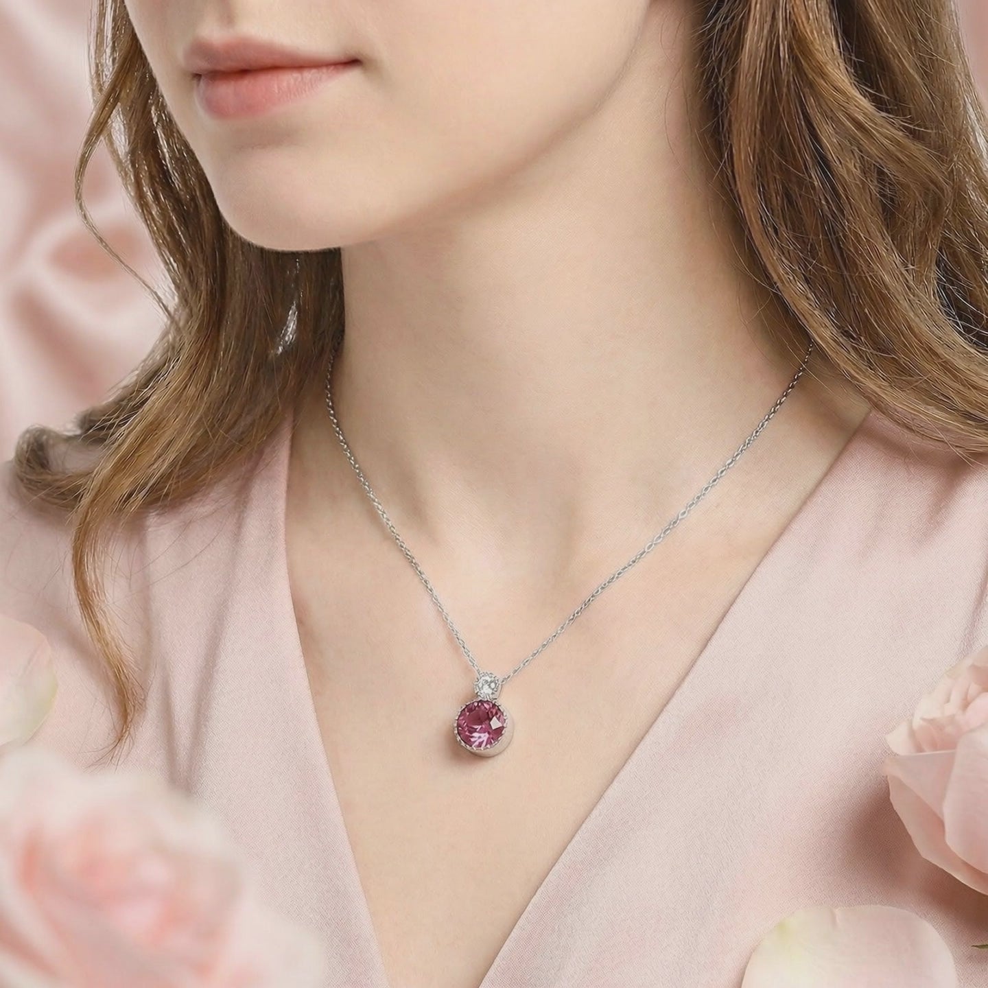 Angled side view of the S925 sterling silver pendant necklace with a round-cut simulated pink tourmaline on pink silk.