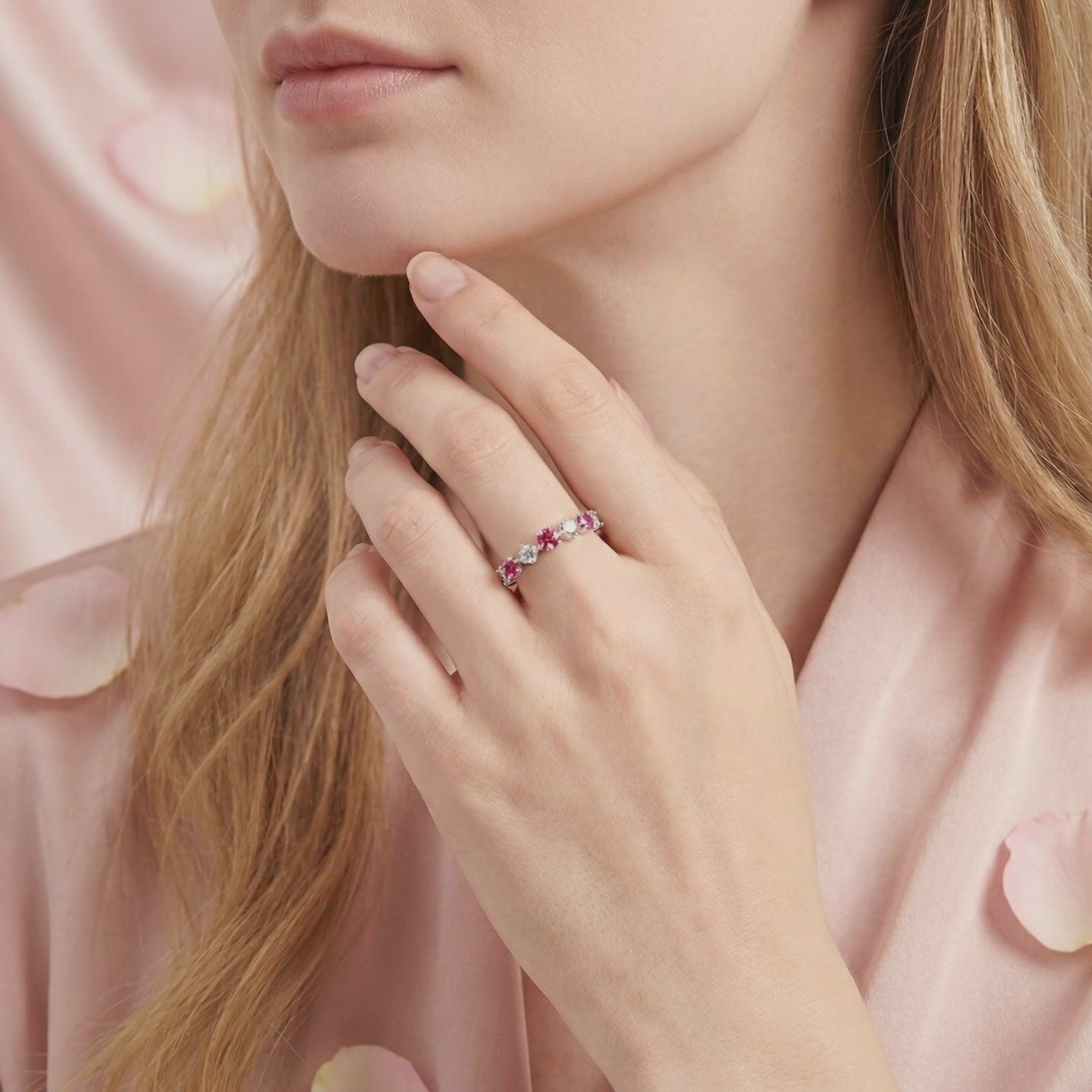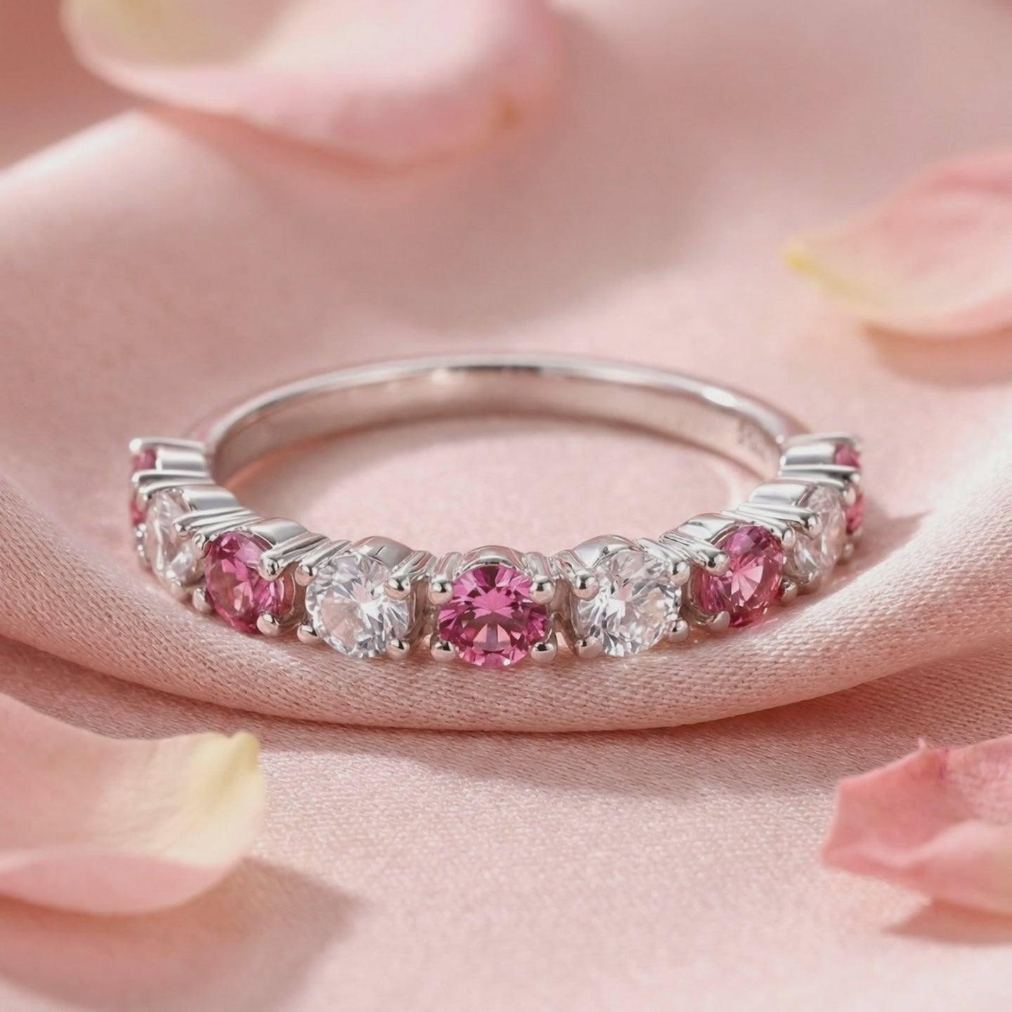 Mined tourmaline is rarely consistent in its saturation. This October birthstone ring is engineered to achieve the ideal raspberry pink benchmark every time. Featuring alternating round-cut Simulated Pink Tourmaline and high-performance A5 stones, it delivers the visual physics of a museum-grade heirloom without the mining markup.
