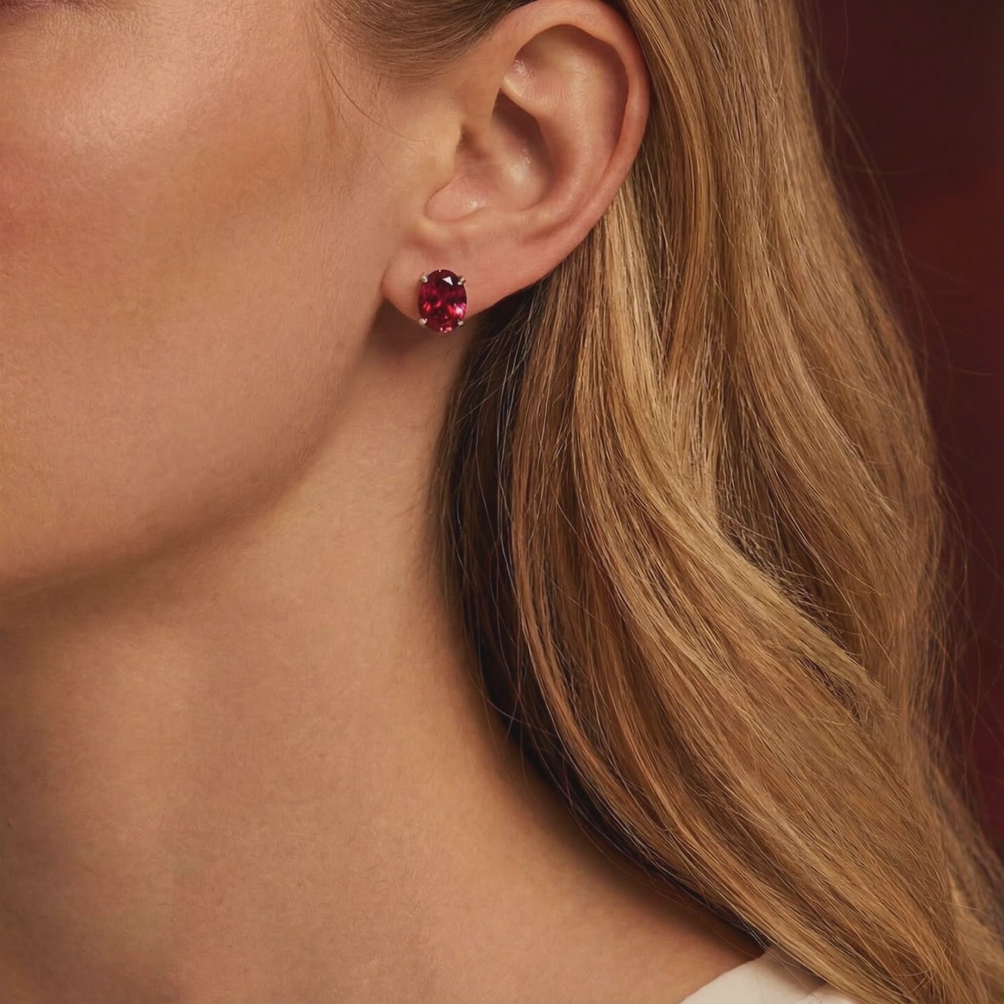 Mined rubies are rarely perfect. This is Simulated Ruby, color-calibrated to achieve the intense "Pigeon Blood" red benchmark with flawless clarity. Engineered for maximum light return, these earrings offer the exact visual profile of museum-grade stones without the industry's scarcity markup.