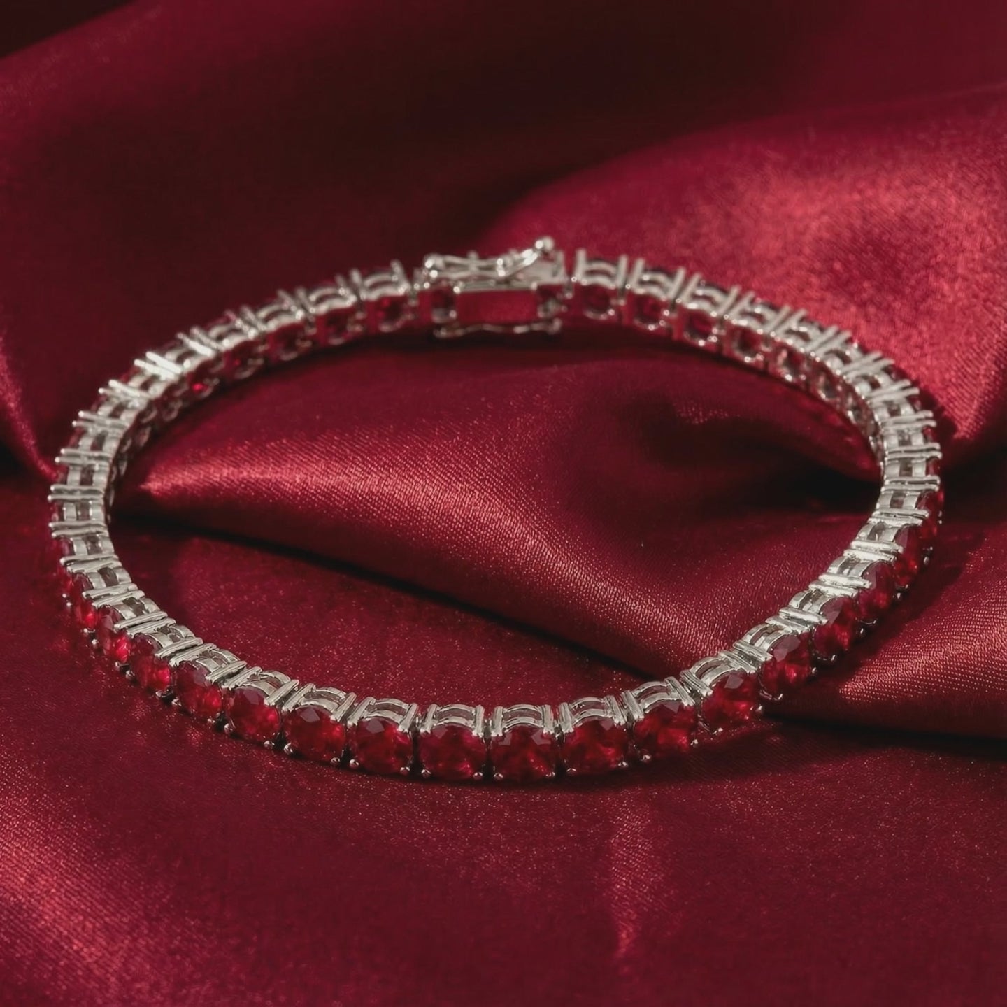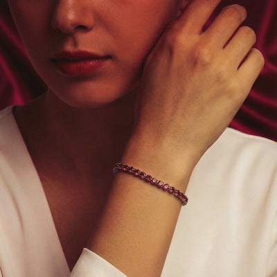 Mined rubies of this clarity and intense saturation are historically rare and prohibitively expensive. We have engineered the perfect alternative. This July birthstone tennis bracelet features precision-cut Simulated Rubies, color-calibrated to deliver a deep red fire that nature rarely achieves with such uniformity across 40+ stones.