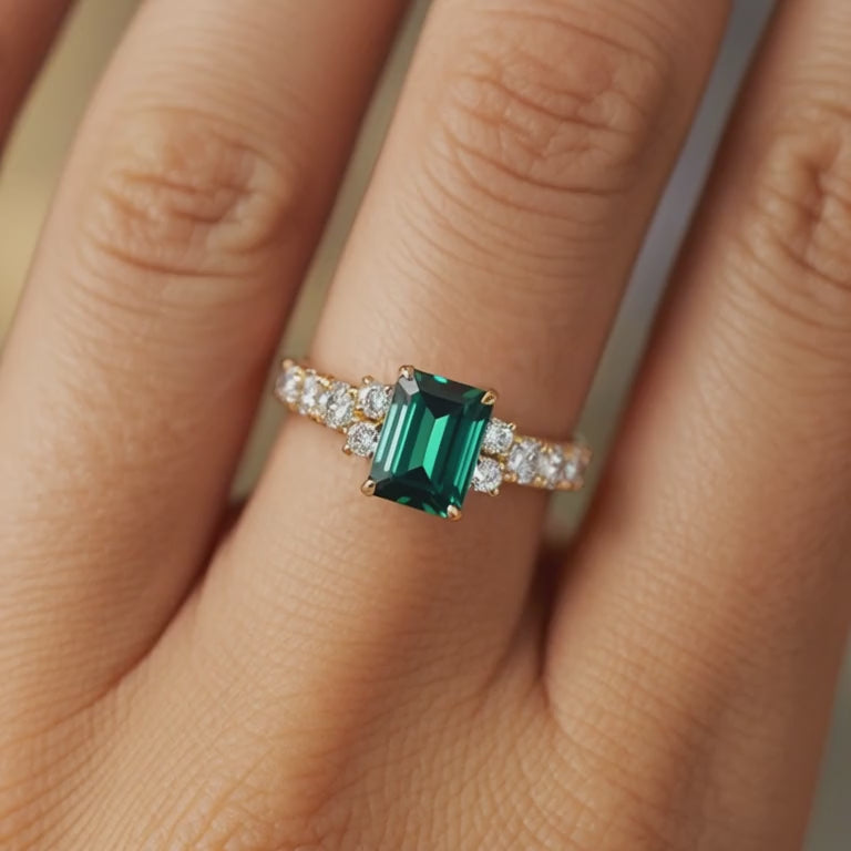 What gem radiates exotic elegance? The Adelina Rae 2CT Emerald Cut Green Moissanite Ring. Say hello to The Adelina Rae, a ring that captures nature's luxury and brings a sophisticated allure.