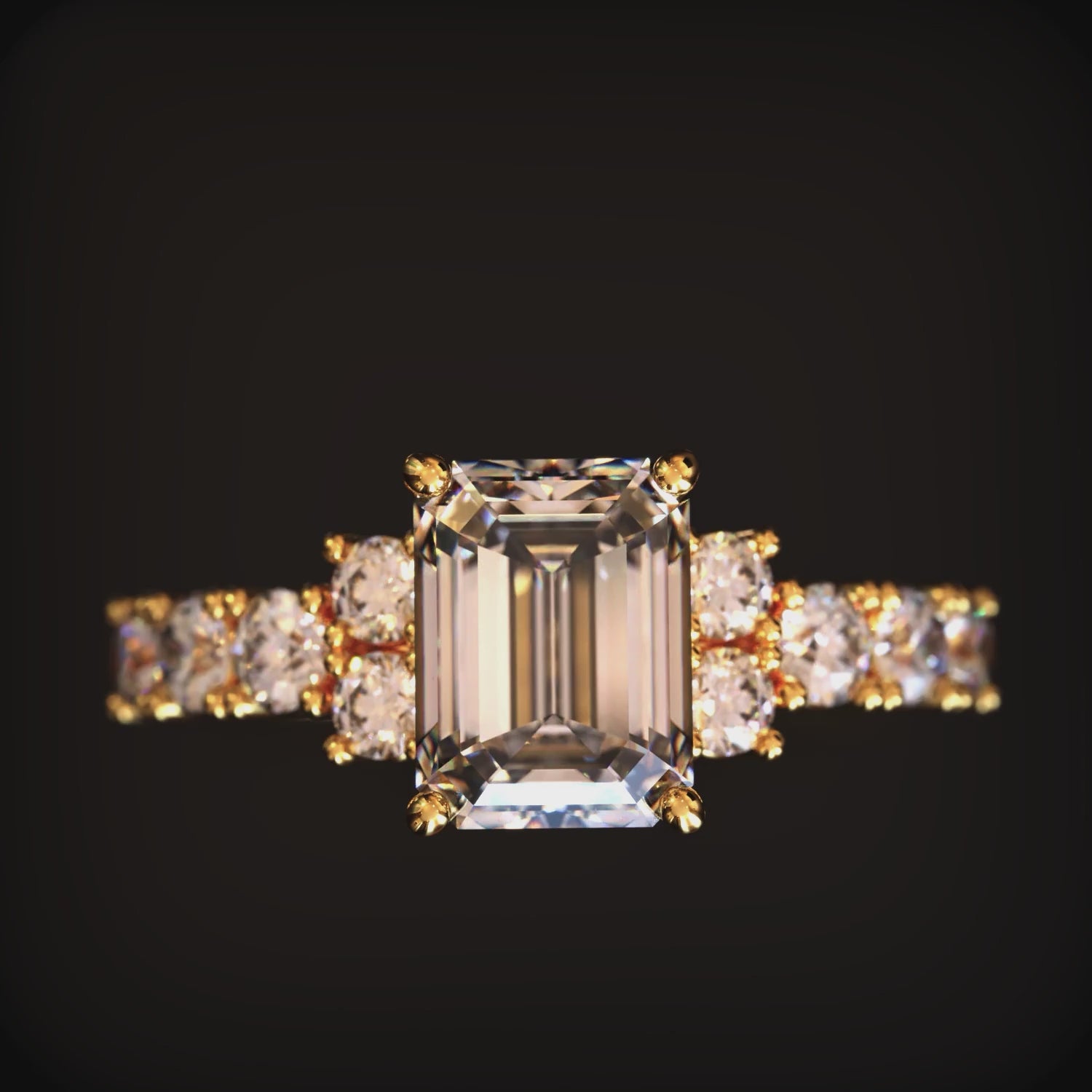 - Exquisite Craftsmanship: The sleek emerald cut is beautifully complemented by a band adorned with sparkling pavé side stones, adding an extra layer of brilliance.