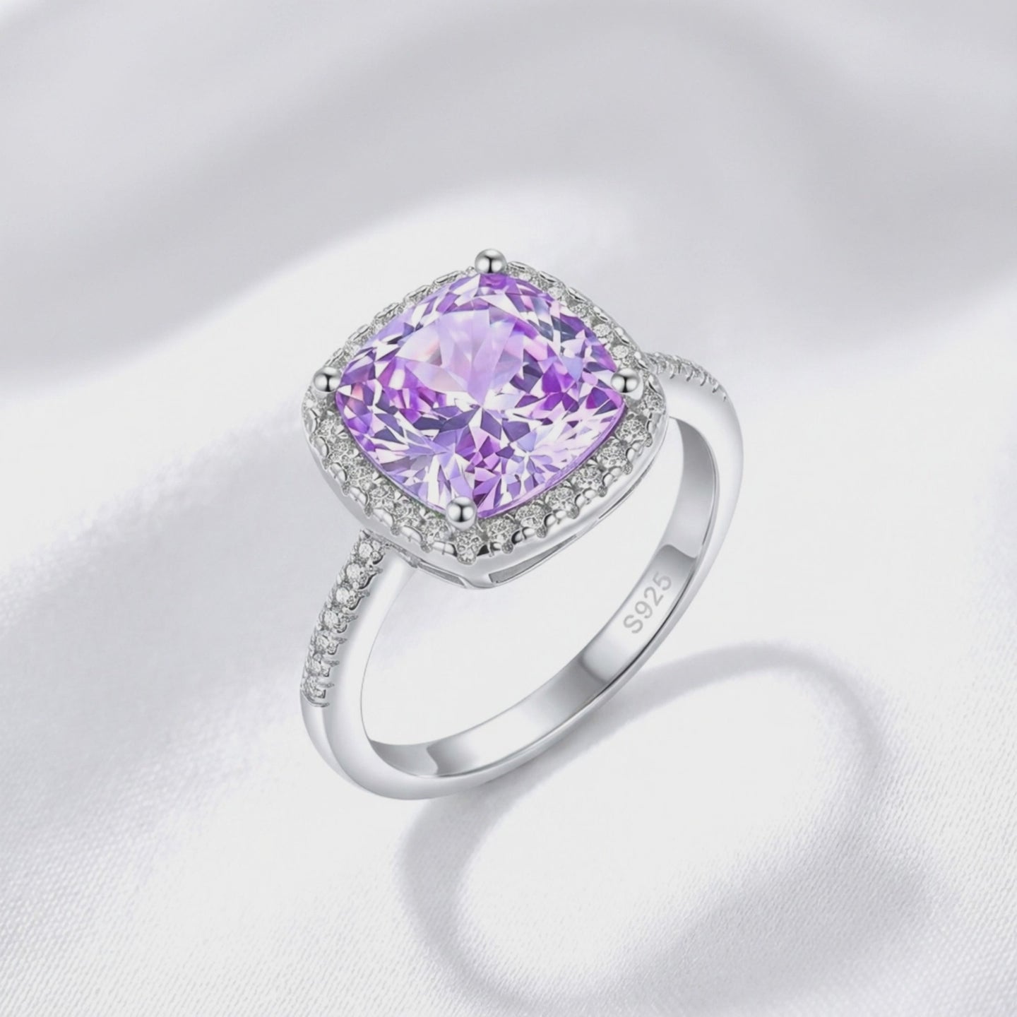 - Design: Cushion-cut halo setting with high-brilliance accent stones.