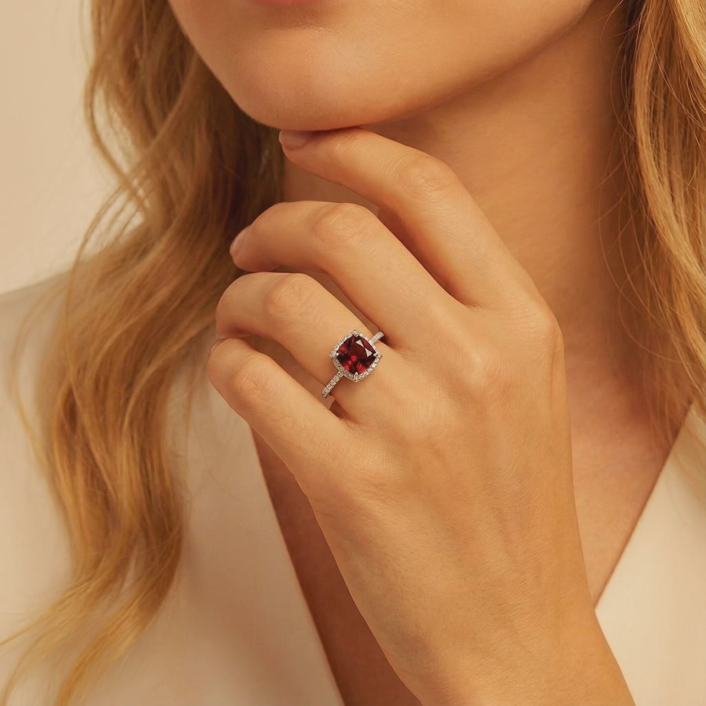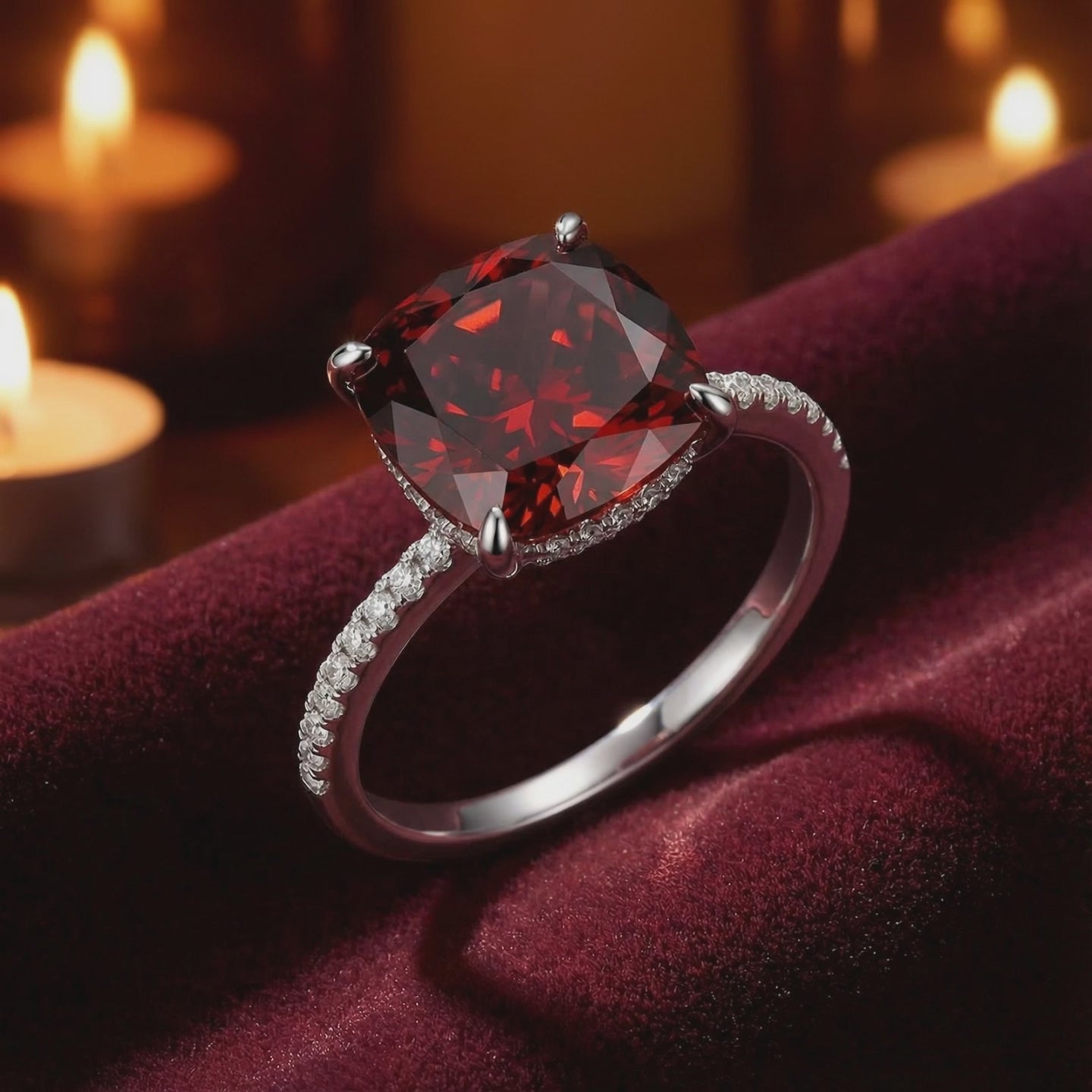 Side view of cushion cut red garnet ring showing the hidden halo and pave S925 sterling silver band.