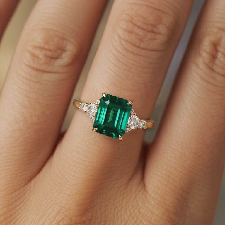 Let's talk about The Bella Jewel - this ring is not messing around. At its heart sits an emerald-cut moissanite, glowing with a rich, verdant green that captures attention. It's got the kind of sparkle that makes diamonds do a double-take, and it comes with a price tag that won't break the bank.