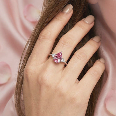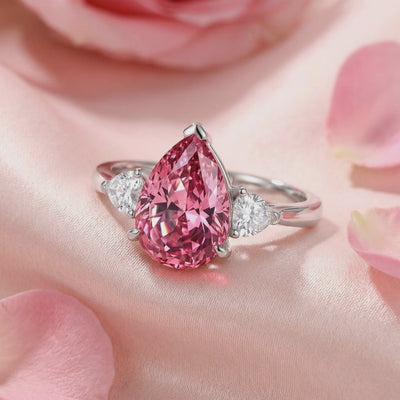 Angled view of a pear-cut simulated pink tourmaline S925 sterling silver ring resting on pink fabric with petals.