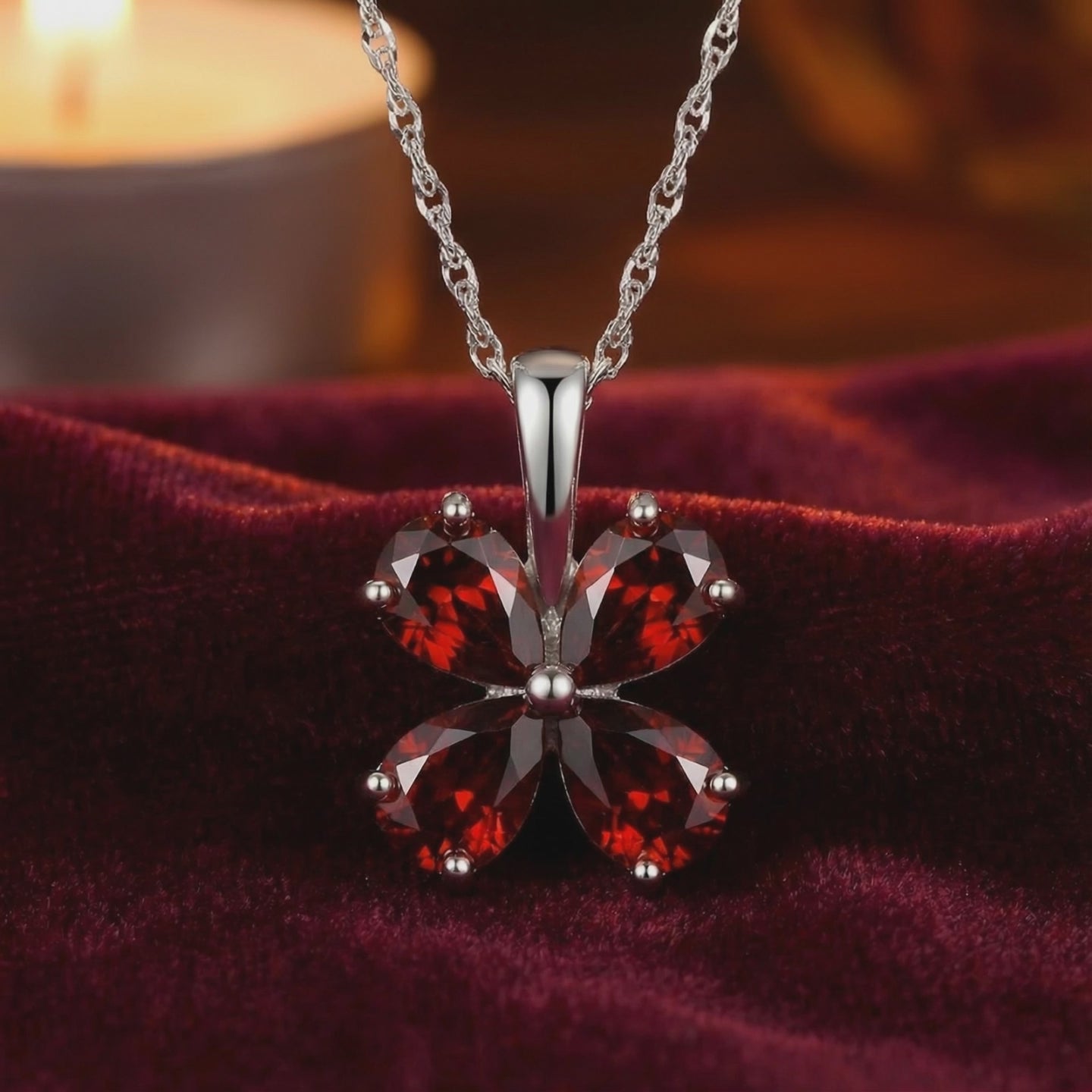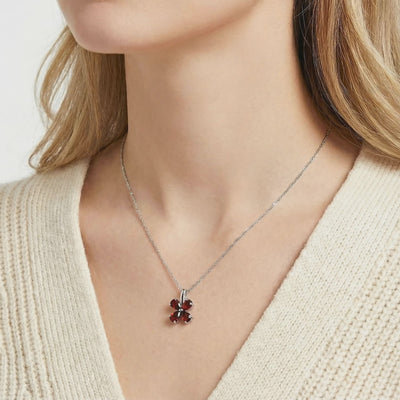Mined garnets are often inconsistent, varying from muddy browns to pale reds. The Estara Clover features Simulated Garnet, engineered to match the coveted deep red saturation of the absolute ideal specimen. Precision-cut from A5 Grade material for maximum light return, this clover-shaped necklace captures the visual physics of a museum-grade heirloom without the mining markup.