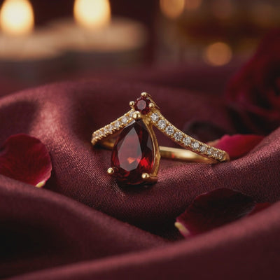 Engineered for everyday elegance, the sweeping V-shaped band is cast in hypoallergenic S925 sterling silver and finished in rich 18K gold vermeil. The warm golden undertones act as a mirror, amplifying the garnet's intense red hue, while a brilliant pavé of 5A zircon accents provides a breathtaking contrast. Because true luxury requires no secrets, your natural gemstone arrives with an independent laboratory certificate verifying its authentic, earth-mined origins.