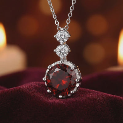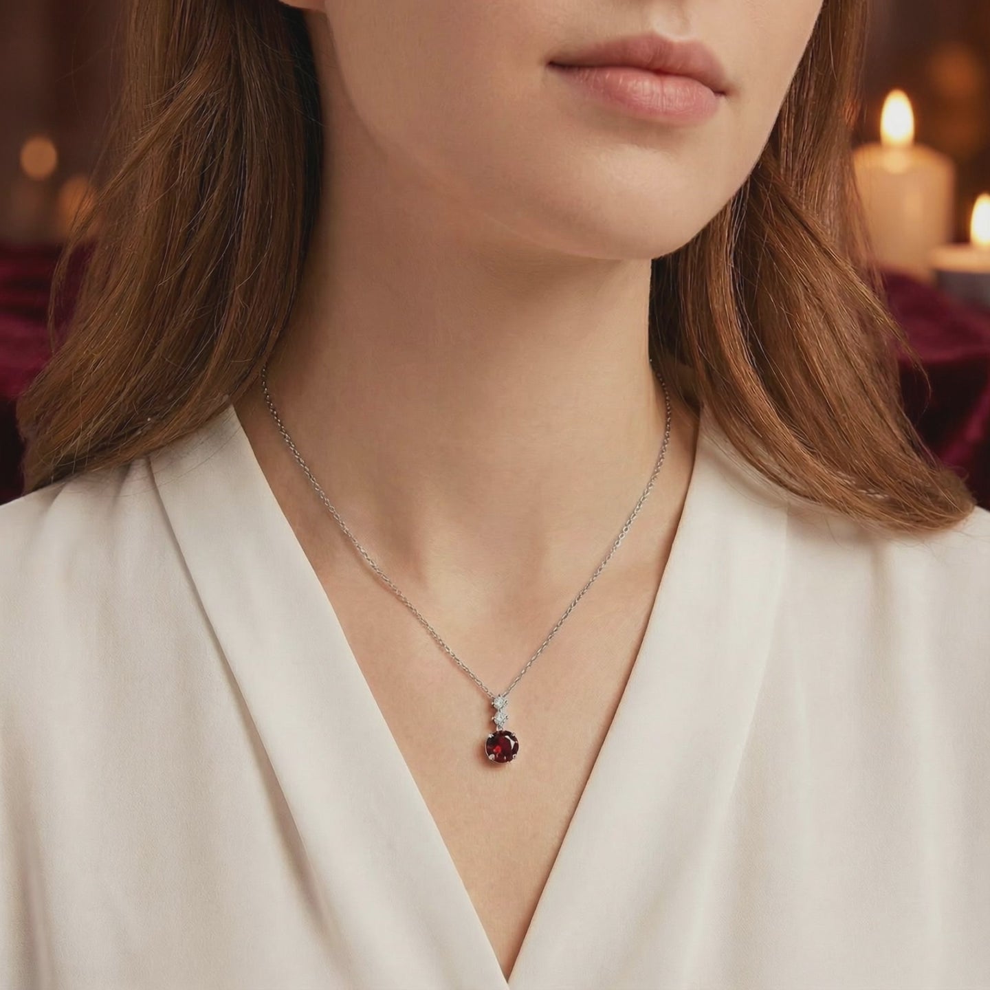 - Stone Specs: 6.5mm Simulated Garnet (A5 Grade) with engineered accent stones.