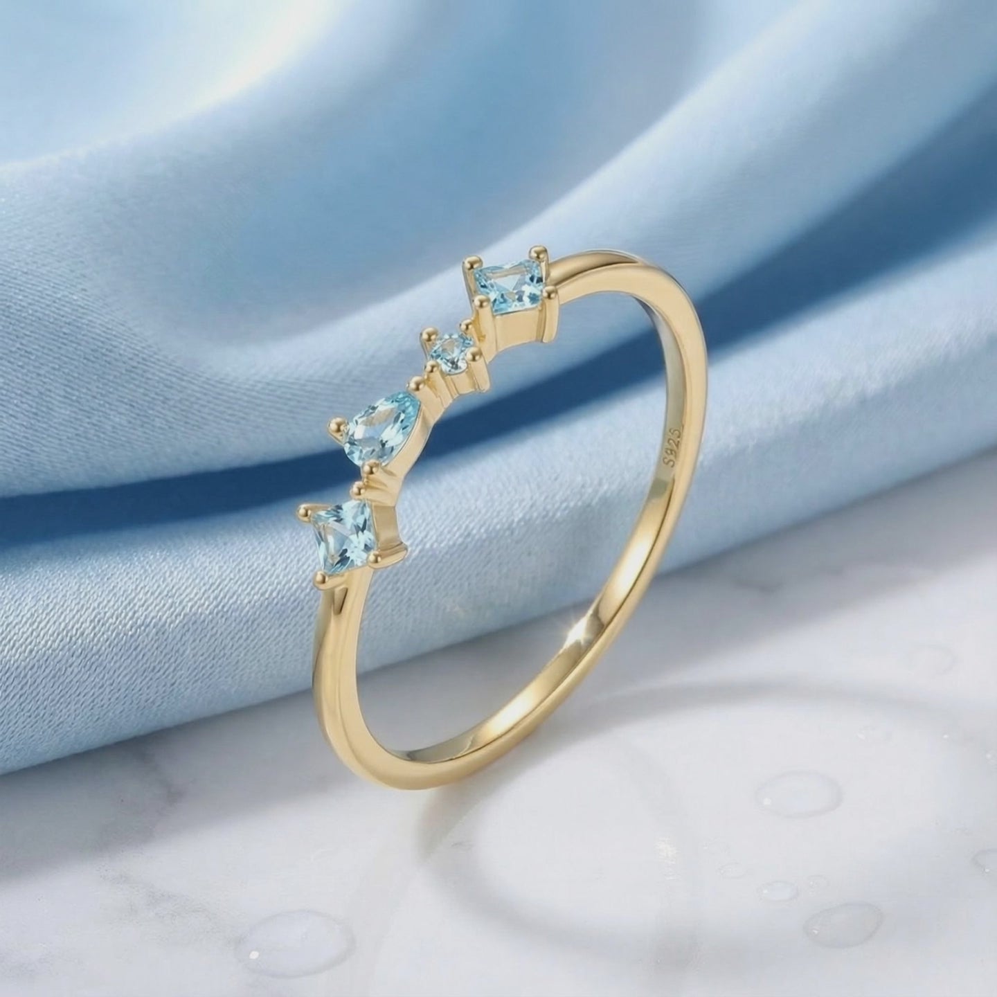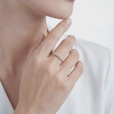 Nature rarely delivers the flawless clarity and light blue saturation required for a perfect Aquamarine. We engineered it. This ring features precision-cut Simulated Aquamarine stones, color-calibrated to replicate the elite visual profile of a museum-grade gemstone. Set in a staggered cluster design, the stones maximize the refractive index to deliver consistent fire and brilliance from every angle.