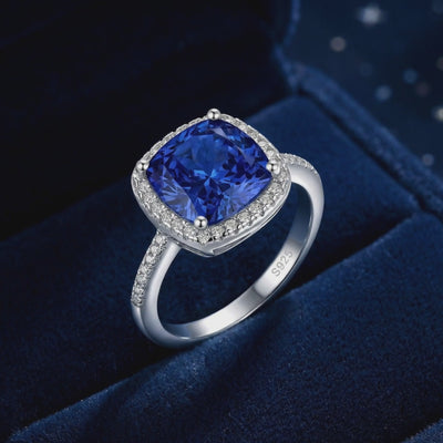 Mined sapphires are often inconsistent, presenting cloudy inclusions or uneven color zoning. This September birthstone ring features an engineered Simulated Sapphire, color-calibrated to the absolute ideal: a deep royal blue with velvety saturation. The cushion-cut center stone is surrounded by a precision-set halo, designed to maximize light dispersion and visual impact without the scarcity tax of mined gems.