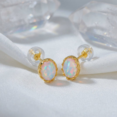 Watch the inner fire dance with your every movement. Formed over millions of years, the natural white opal at the center of each stud features a completely unique geological fingerprint. As light hits the microscopic silica spheres within the untreated stone, it diffracts into a mesmerizing play-of-color, making these earrings a breathtaking and truly one-of-a-kind addition to your daily wear.
