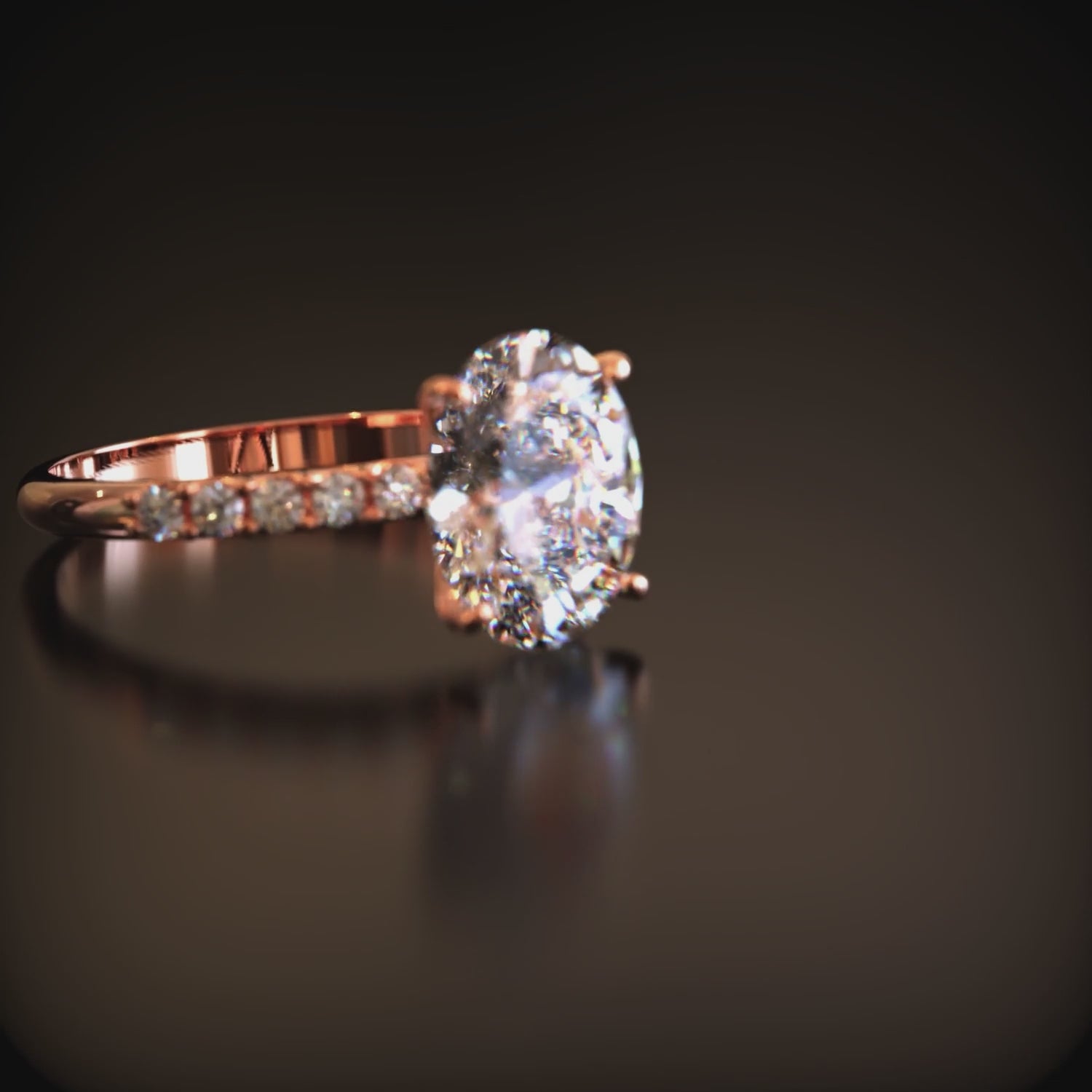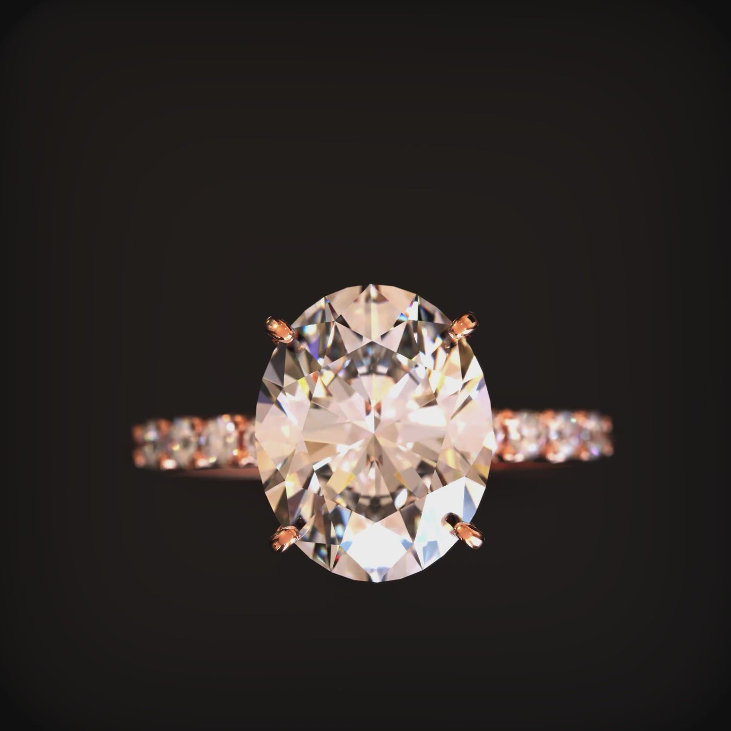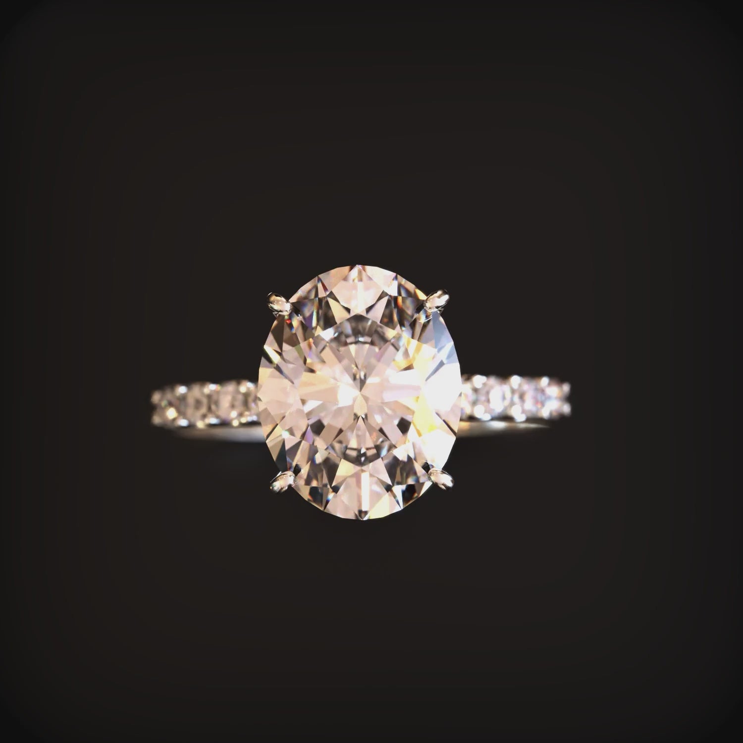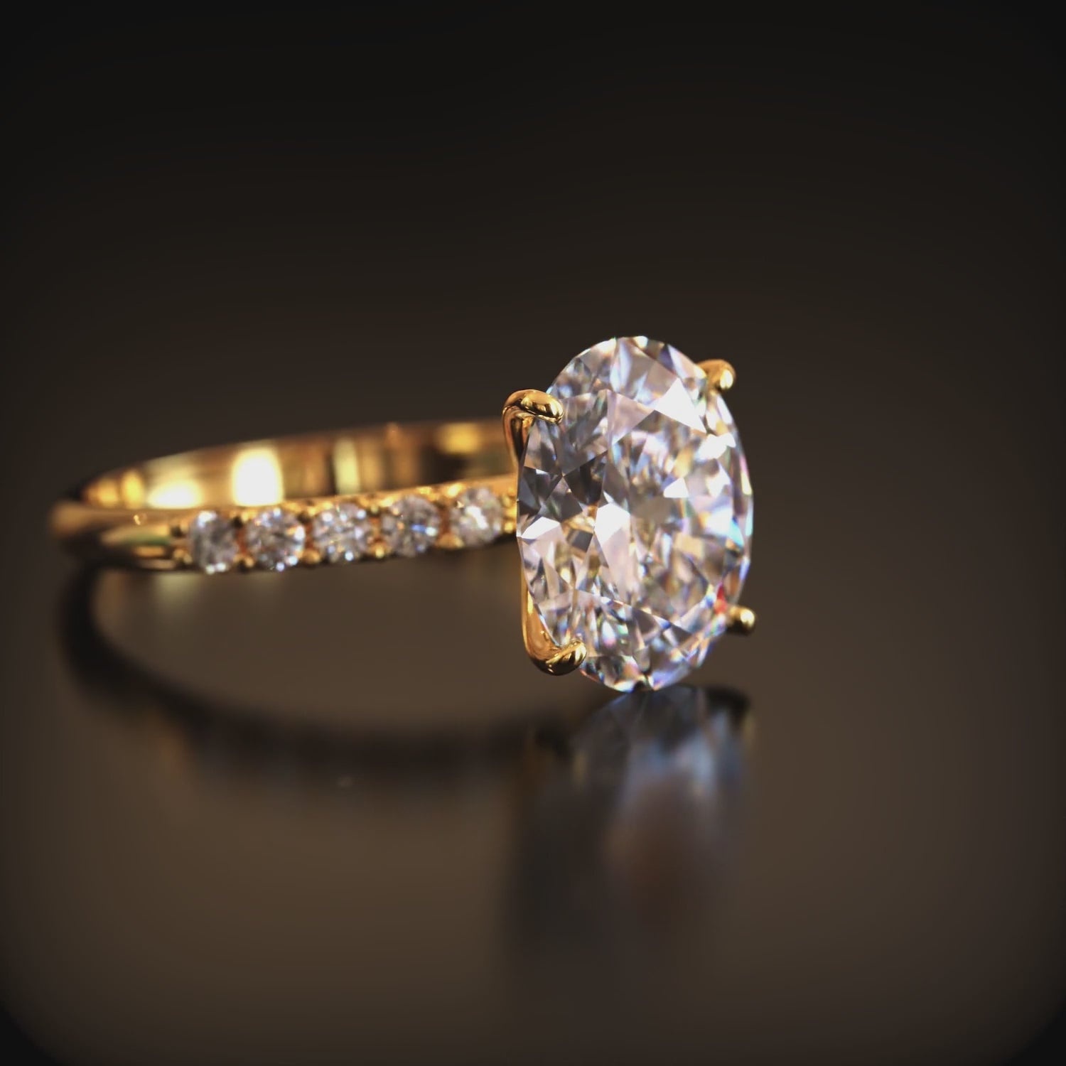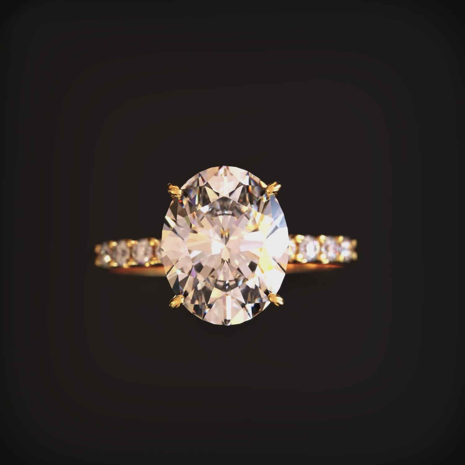 At its heart lies a 3-carat oval moissanite, a stone that rivals diamonds in brilliance and clarity. Set in a classic prong setting, it's like this beauty is sitting on a throne, commanding attention from every angle.