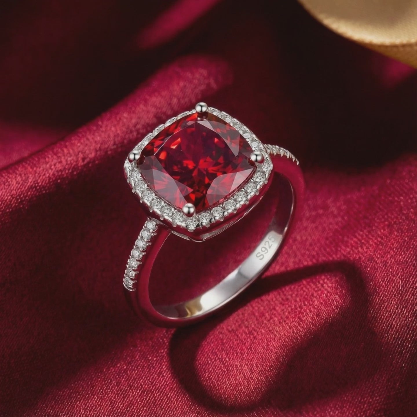 • Center Stone: Cushion-Cut Simulated Ruby (July Birthstone)