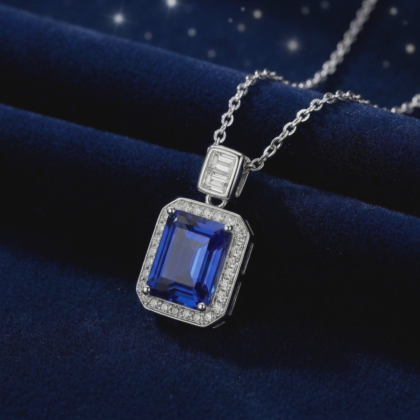 Nature rarely delivers the perfect sapphire; engineering does. This necklace features a museum-grade Simulated Sapphire, color-calibrated to achieve the deep royal blue with velvety saturation that collectors spend years searching for. The precision emerald cut is designed to showcase the stone's flawless internal clarity and maximum light return.