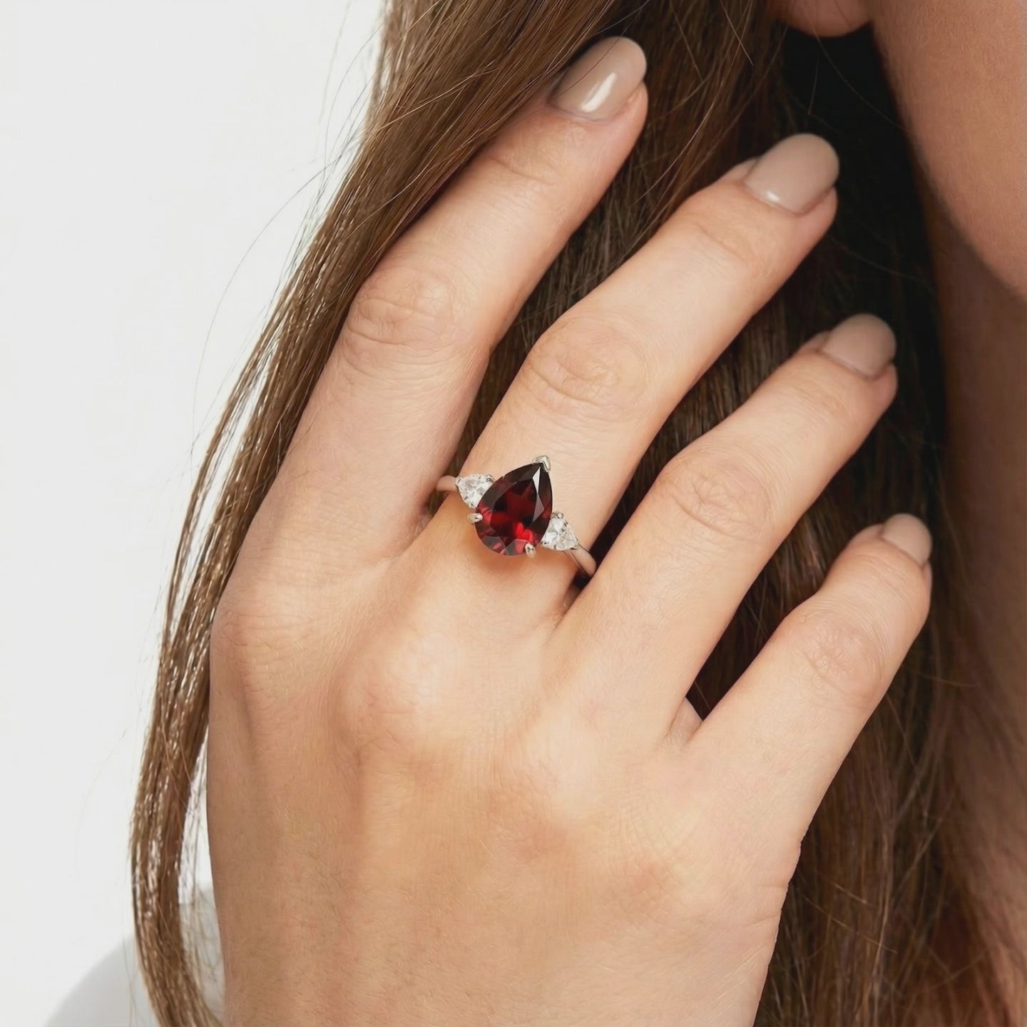 Nature rarely produces a garnet with this level of clarity and deep red saturation. We engineered it. This Simulated Garnet provides the visual physics of a museum-grade gemstone without the common cracks or the mining markup found in Earth-mined stones. This ring features a precision-cut pear-shaped center stone, meticulously calibrated for maximum brilliance and light dispersion.