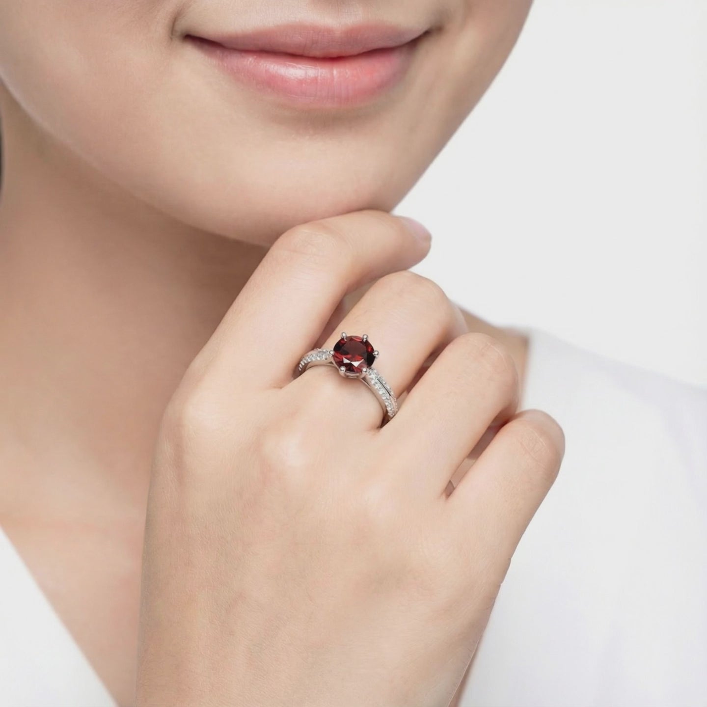 Angled macro view of a round cut simulated garnet and pavé side stones on a sterling silver ring setting.