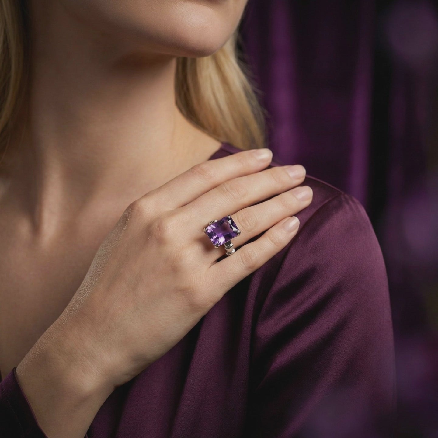 Radiate the regal elegance of the ages with The Soraya Square Ring. Boasting a massive 10x14mm Natural Amethyst, this piece features a deep, saturated violet hue that commands attention from across the room. The precision-faceted Square Cut sacrifices rough material to eliminate windowing, ensuring that every angle captures and refracts light with mesmerizing brilliance.