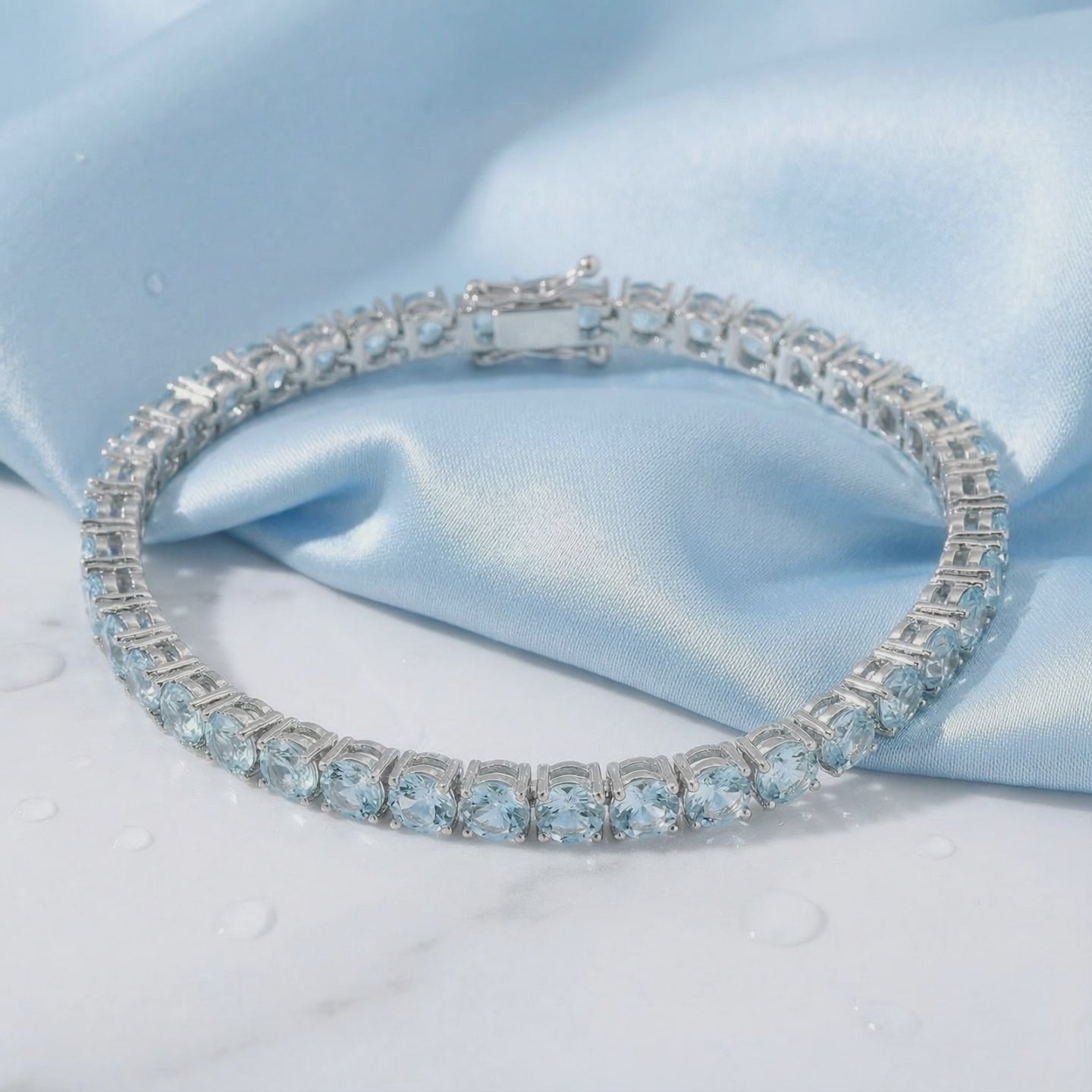 Mined aquamarine is often pale and structurally inconsistent. This simulated aquamarine tennis bracelet is engineered to match the ideal light blue saturation found in the top 1% of ocean-grade stones. Every stone is color-calibrated for absolute uniformity, ensuring your bracelet has a consistent glow from every angle.