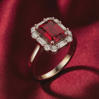 Mined rubies are often cloudy and dull. This ring features a Simulated Ruby, engineered to match the coveted "Pigeon Blood" red benchmark. We use A5 Grade material precision-cut into an emerald shape to ensure maximum light return and deep, consistent saturation that nature rarely produces.