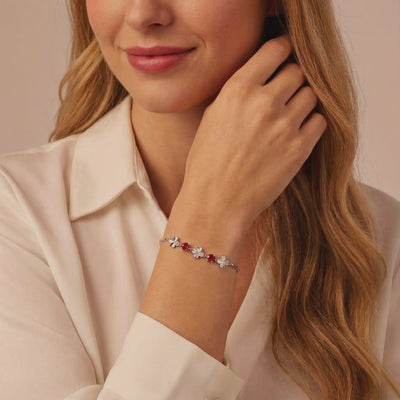 Mined rubies often suffer from "silk" inclusions and brownish undertones. We engineered the solution. This July birthstone bracelet features simulated rubies color-calibrated to the iconic "Pigeon Blood" red standard. Each stone is precision-cut from A5-grade material to ensure flawless clarity and intense fire that nature rarely achieves.